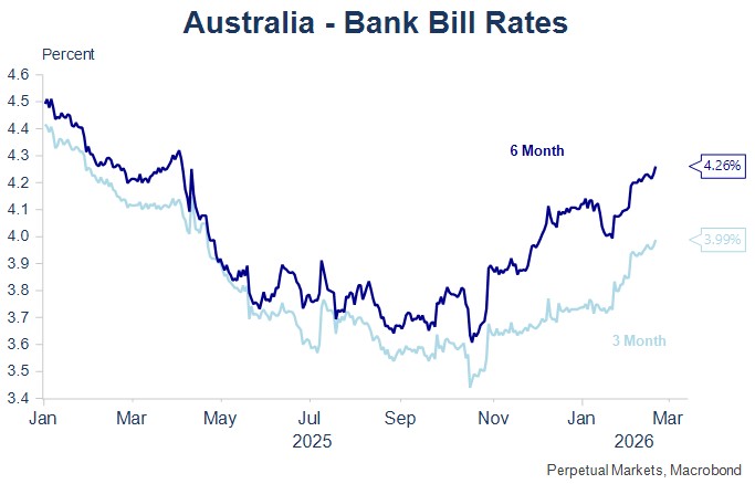 Over the past week, Australian bill rates continued to lift, principally on the back of the stronger than expected Australian January labour market data. The Australian market is now pricing a further 1.4 interest rate increases over 2026, with the next increase almost fully priced by the June Board Meeting.