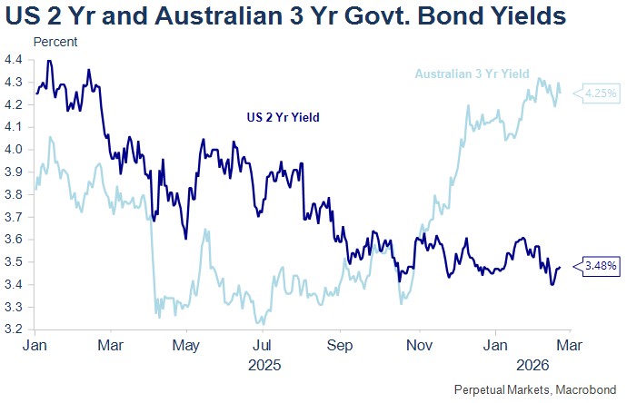 At the same time, US markets continue to price interest rate cuts, with two further cuts priced in 2026 (one by July and the second by December), and a further half a rate cut in the first half of 2027. FOMC members and the Fed chair have been communicating that an ultimate moderation in US inflation toward target would be sufficient to bring about some further easing, though, it appears that some of this pricing might also reflect ultimate concerns of the impact of AI on the US labour market. The latter will ultimately impact on the Australian economy and interest rates also, though in the short term, higher Australian yields reflect the pricing of the divergent track for the respective central banks.