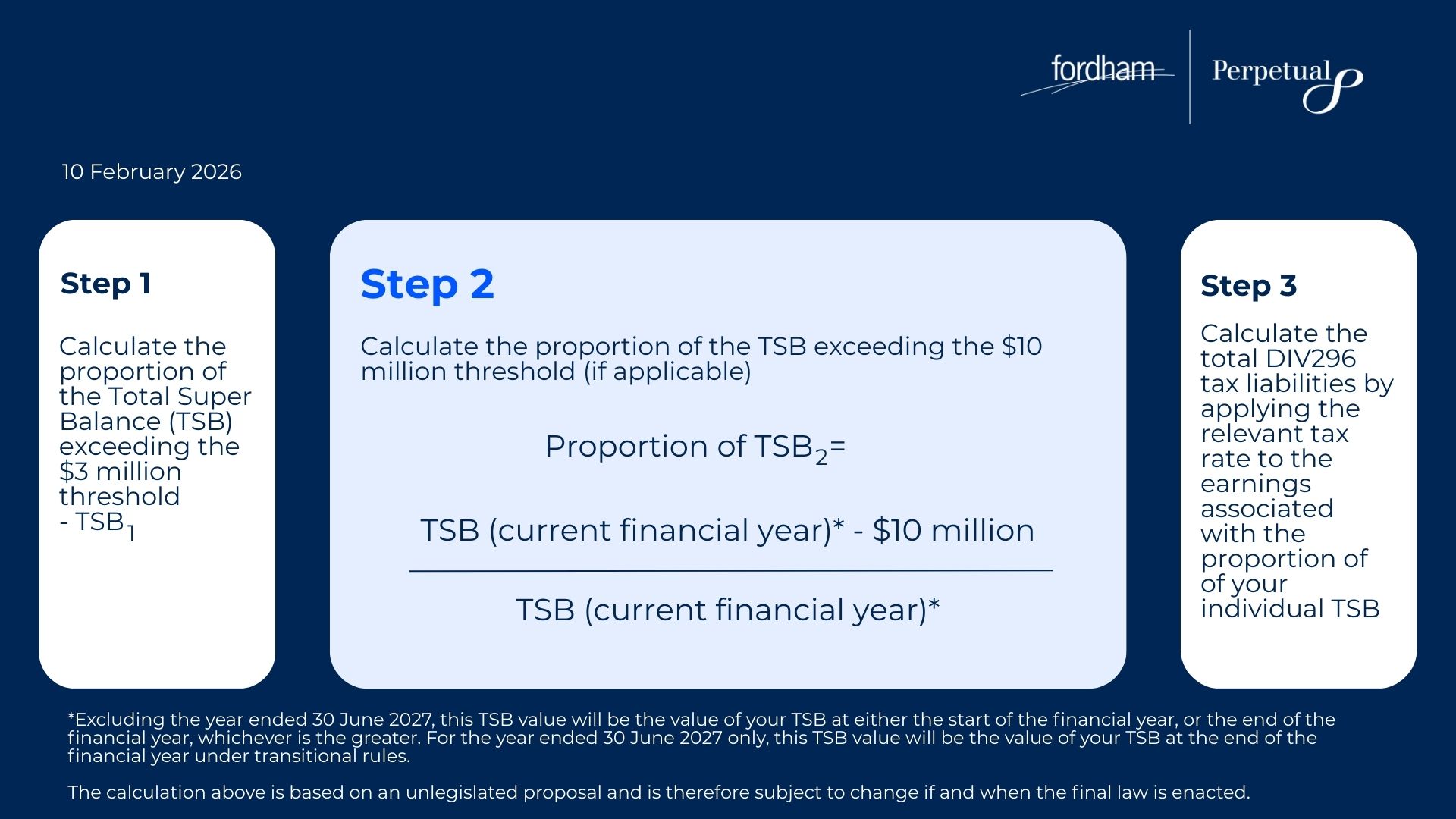 In 2026/2027, the TSB value that will be used for this purpose will be the TSB value at the end of the financial year. However, from the 2027/28 financial year onwards, an individual’s TSB at both start and end of the financial year will be assessed for the Division 296 Tax purposes, with the higher of the two balances used in the calculation.